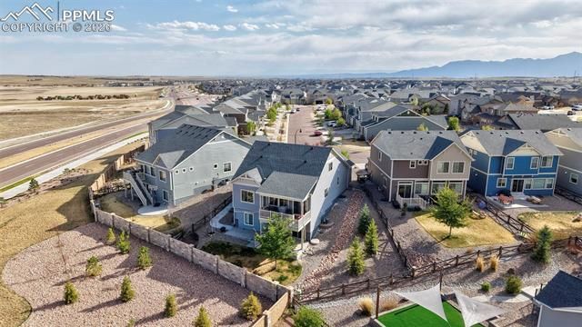 Incredible 5 bedroom home with NO REAR NEIGHBORS, and a great layout for multigenerational living, in Banning Lewis Ranch. Entering through the covered front porch the home opens into a picturesque open floor plan featuring two main floor bedrooms. The living area flows seamlessly into the eat-in kitchen with natural light flowing throughout the home. The kitchen boasts a barstool height center island, stone countertops, stainless steel appliances, ample cabinet and counter space, and pantry. Just beyond the dining area provides walk-out access to the covered back porch, a perfect space to enjoy a morning cup of coffee in the summer months. The back porch provides stair access down to the fully landscaped and fenced backyard. Back inside the main level has the spacious primary suite just off the living area with ensuite bath including a stand-alone shower, double vanity, and walk in closet. A second bedroom, full bath, and laundry space complete the main level. The upper level has an incredible loft currently being utilized as a children's play area, but could be a tv room, workout area, or any number of possibilities depending on needs. The upper level has bedroom three with a full ensuite bath creating a second primary suite within the home. The basement level impresses with a spacious family room that provides walk-out access to the back yard and bedrooms four and five with another shared full bath. This home has it all and is ideally located in the Banning Lewis Ranch community with amenities galore, including neighborhood schools in walking distance, over 65 acres of parks/trails/open space for hiking/biking, tennis courts, pickleball courts, basketball court, rock climbing, zip-lines, access to pools, splash pad, water park, and dog park. The recreation center houses a fitness center and regularly hosts classes and events for all ages. In the summer months, catch a neighborhood concert, food trucks, farmers market or enjoy other regular community events.
